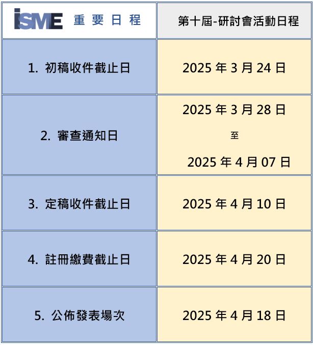 2025年台灣機電工程國際學會年會暨ISME 第十屆 全國學術論壇研討會,將於2025年05月02-03日假國立成功大學